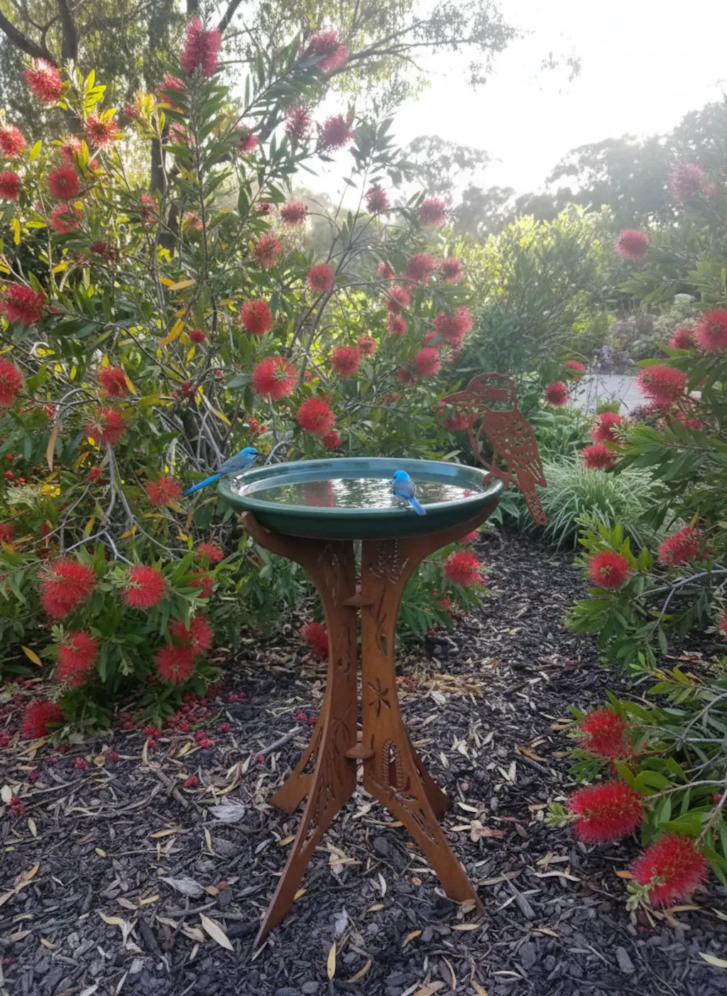 Hand-cut from 3mm Australian steel, the stand features graceful legs detailed with native fern and leaf cutouts that throw beautiful shadows as the light shifts through the day. A kookaburra silhouette sits perched on the rim - calm, watchful, and looking like it has absolutely no plans to move. In weathering steel, the whole piece develops a warm rust patina over time, blending into your garden as naturally as the birds that visit it.