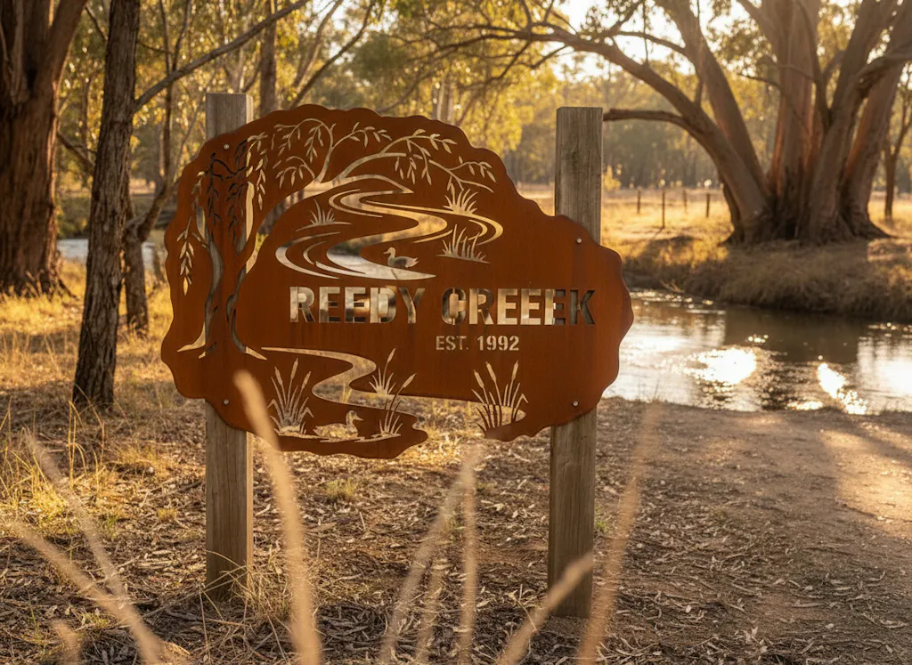 For the property on the creek, the dam, or the river flat - where the willows hang low and the ducks have right of way. 'The Creek Crossing' is an organic-edged property sign where the frame itself follows the natural shape of a willow tree canopy and a creek line, plasma-cut from a single sheet of 2mm Australian steel. Not a straight edge in sight.
