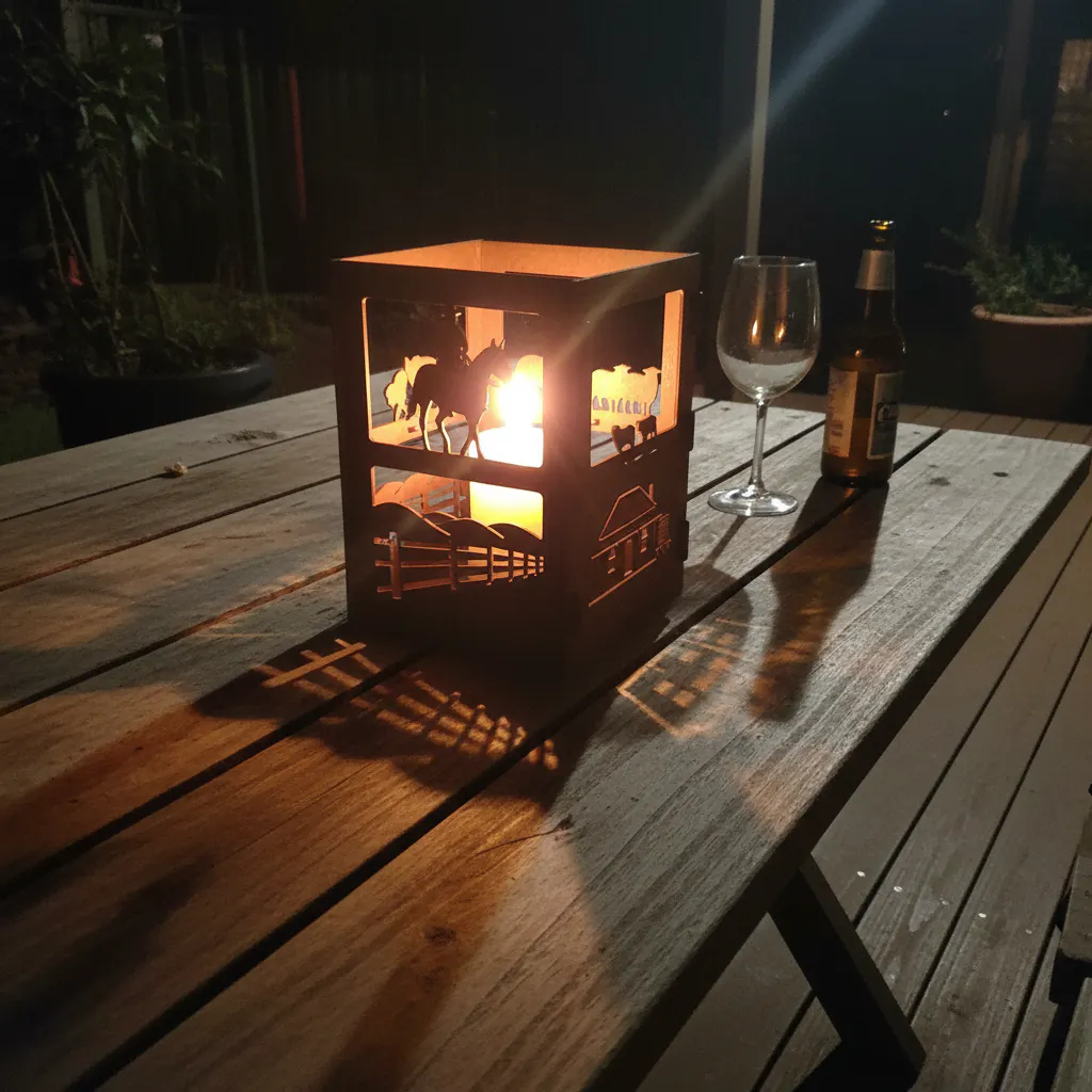 For the country at heart, even if you live in the suburbs. Each panel on this lantern tells a yarn from station life - a stockman riding the high country on one side, a faithful border collie earning its keep on another, a classic post-and-rail fence stretching toward distant hills, and a proper tin-roof homestead with its water tank standing guard.